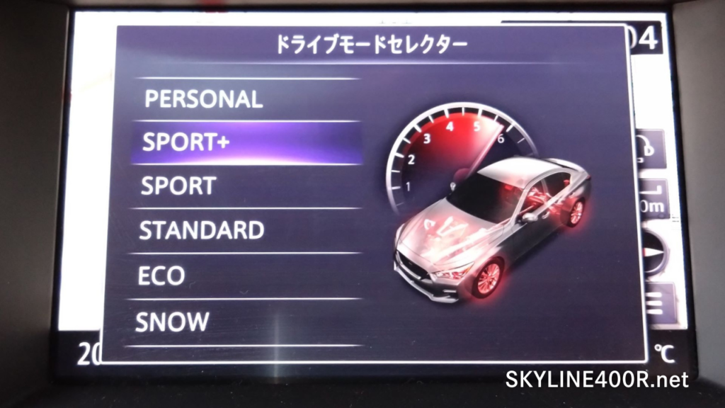 また、V37型スカイライン全車に搭載されたドライブモードセレクターは、車両にあらかじめ設定された複数の走行モード、および特性をオリジナルで設定可能なPERSONALモードから選択可能。設定に応じてサスペンションの硬さ、ステアリング特性などが変化します。